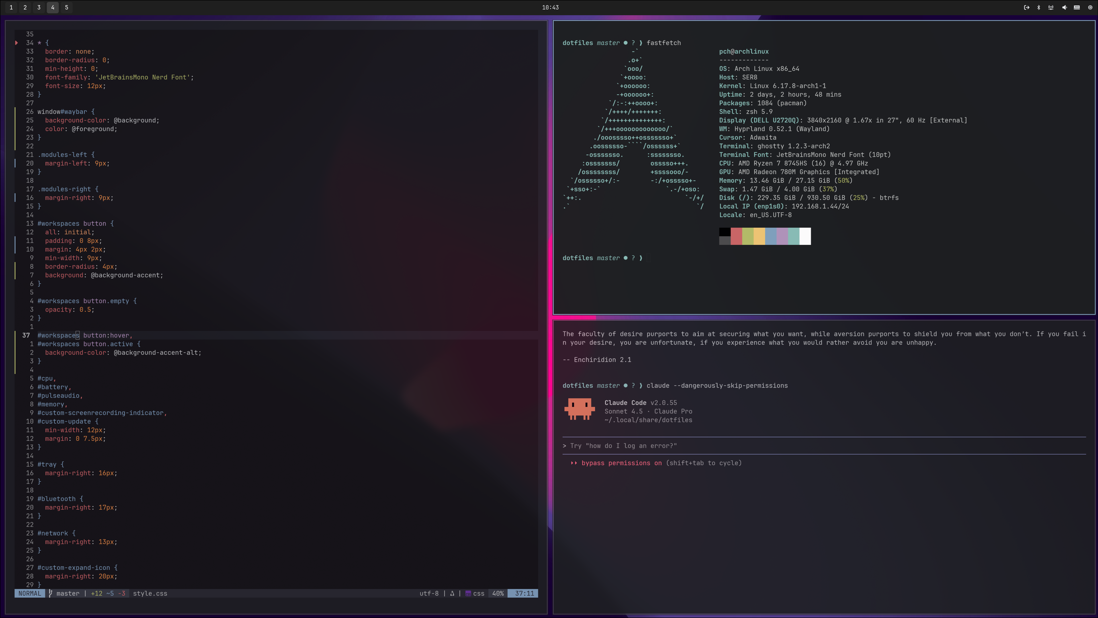 During my brief stint with Arch, I had endless noob issues with config. Whenever I got stuck or needed to make changes to my dotfiles, I ran claude --dangerously-skip-permissions and described the problem.